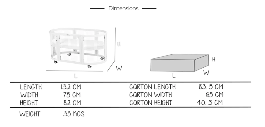 Converts into: Bassinet; 3 Level Cot; Toddler Bed; Table and Chairs and Playpen.